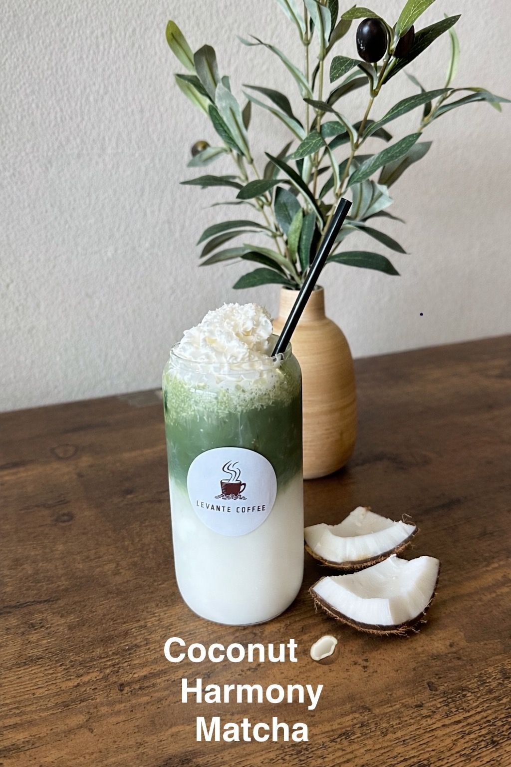 Organic coconut shreds in coconut syrup infused milk topped with smoothly whisked Matcha, whipped cream, and coconut shreds.